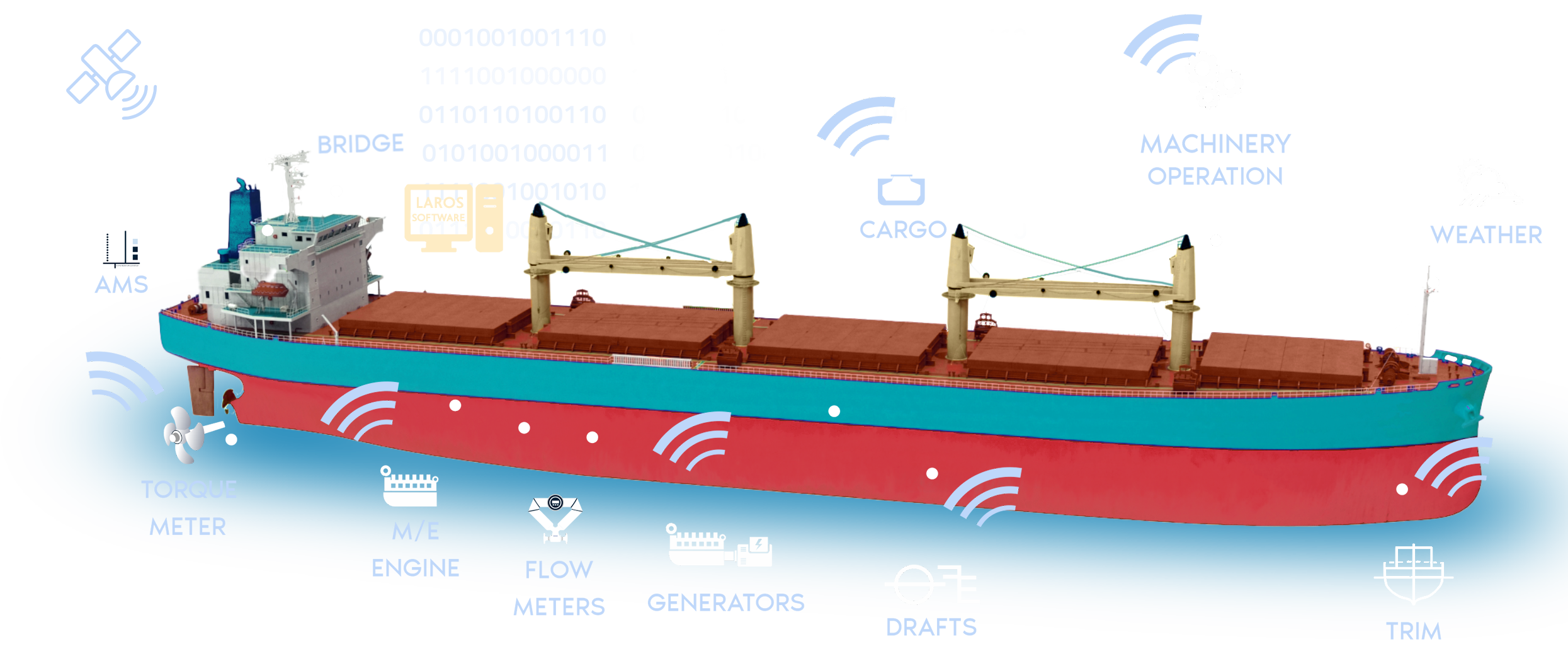 LAROS hardware, including smart collectors, is installed on the vessel. These devices gather synchronized and reliable data from various sensors, instruments, or control systems onboard, all operating under a wireless network.